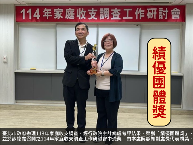 臺北市政府辦理113年家庭收支調查(包括訪問及記帳調查),經行政院主計總處考評結果,榮獲「績優團體」獎,於114年9月1...